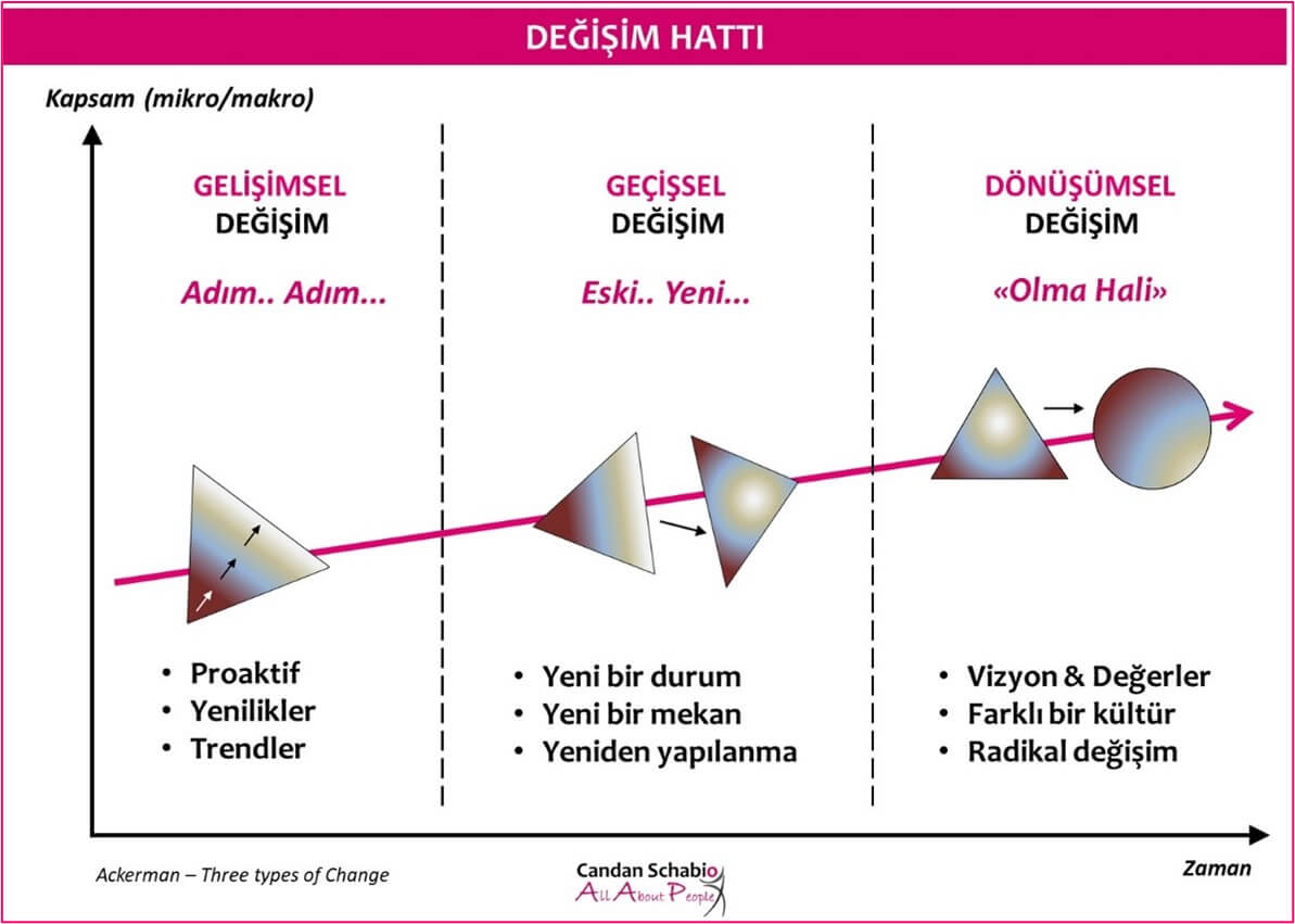 Ben, Değişim Liderliği üzerine çalışan Linda Ackerman’ın yaklaşmını çok beğeniyorum. Ona göre 3 tür değişim vardır (’97):